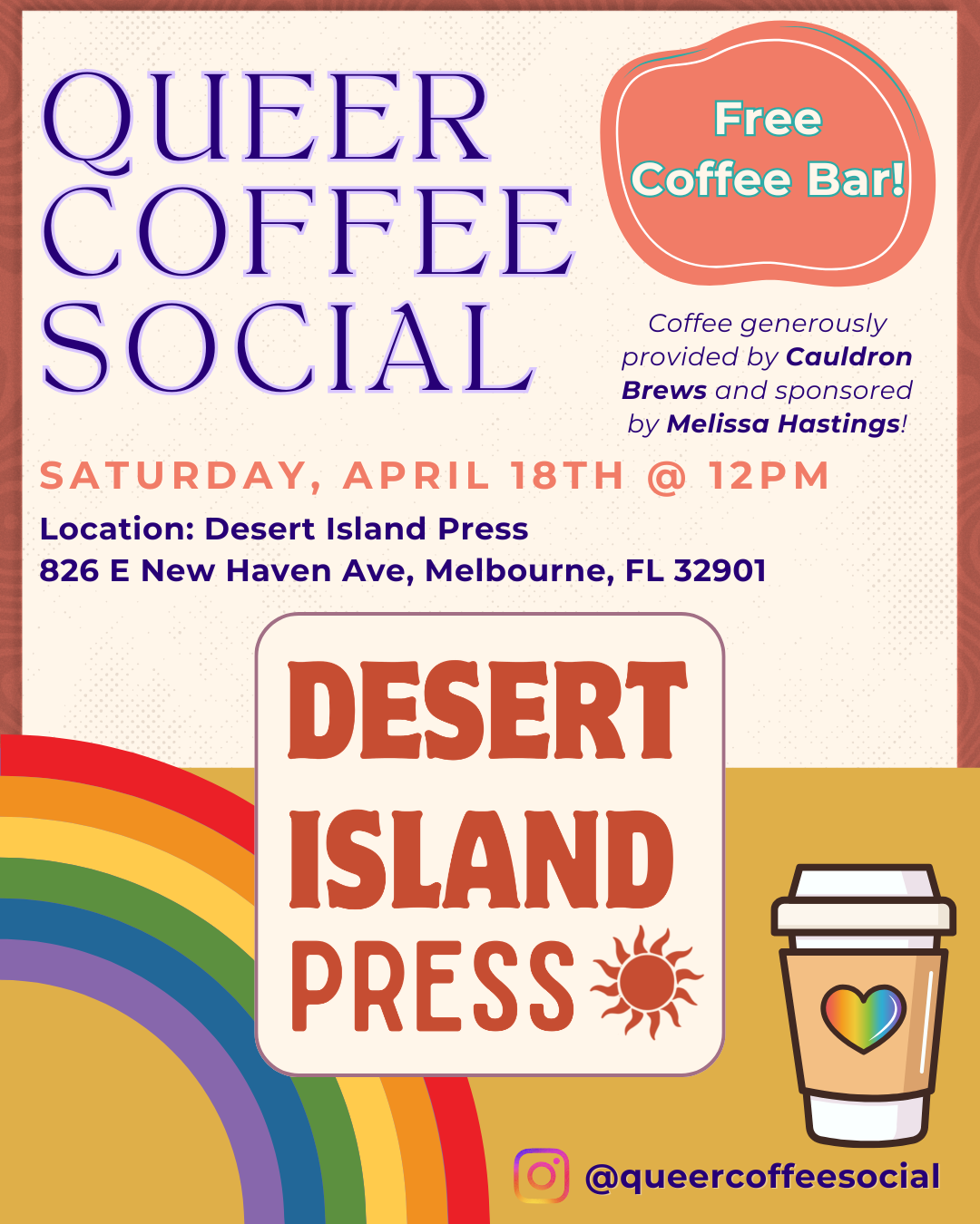 Join us for our monthly Queer Coffee Social at Desert Island Press on Saturday, April 18th from 12pm-2pm!
