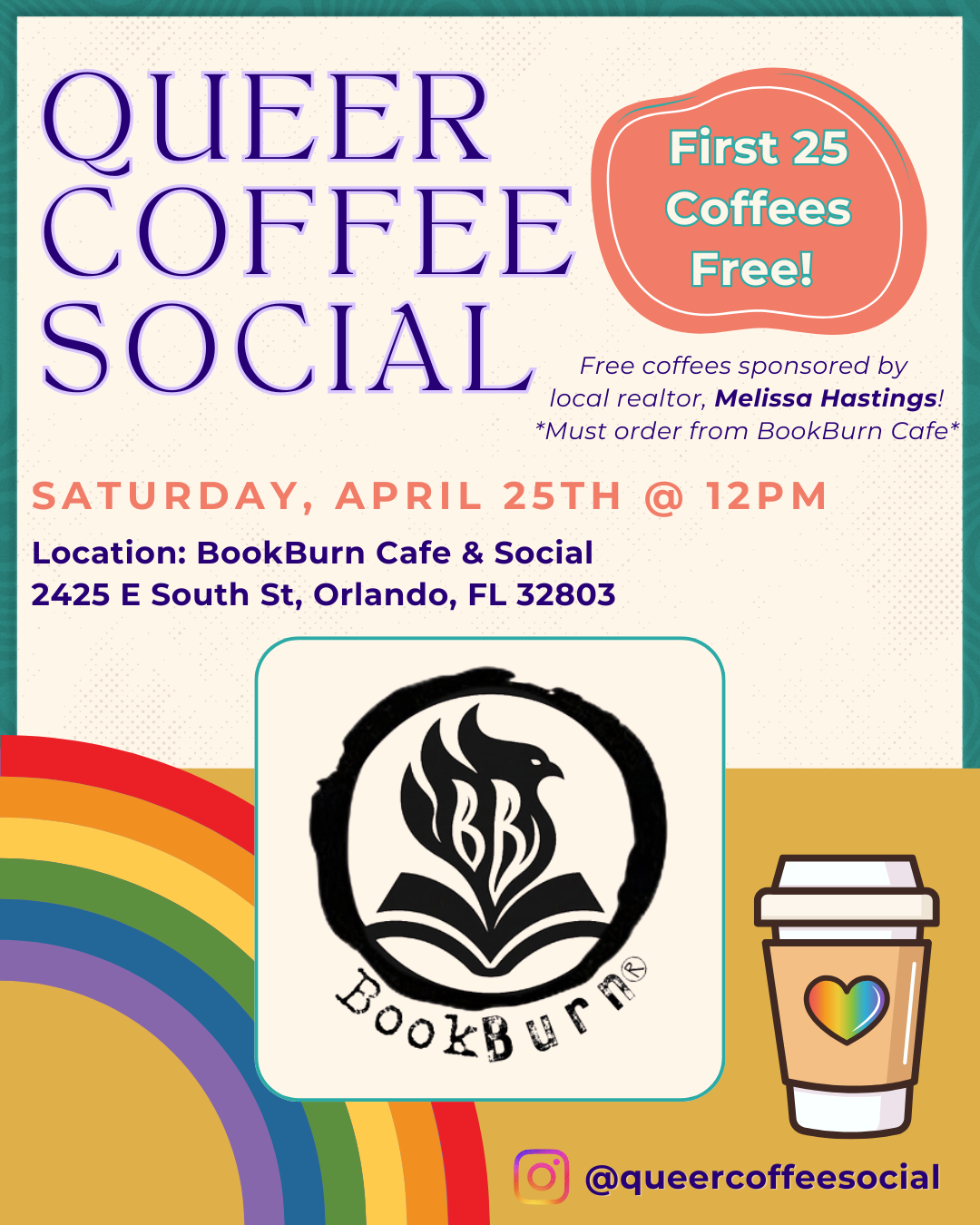 Join us for our first-ever Orlando Queer Coffee Social at BookBurn Cafe & Social on Saturday, April 25th from 12pm-2pm! ☕🌈